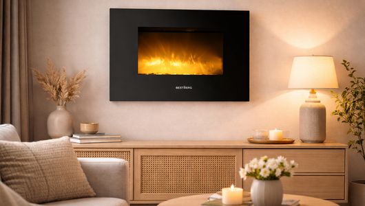Skleněný nástěnný elektrický krb s imitací ohně BestBerg. Vytváří příjemnou atmosféru realistického plamene a zároveň poskytuje praktické přitápění bez nutnosti komínu či složité instalace.