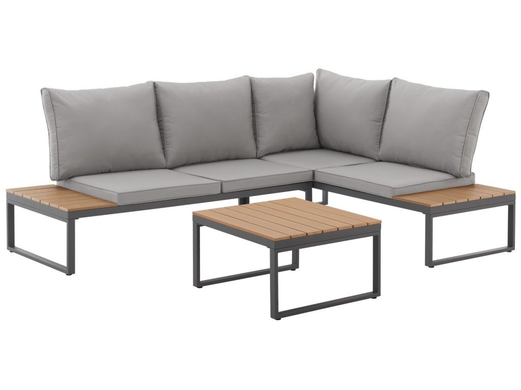 Stolek s dřevěným vzoremSoučástí je nízký konferenční stolek s deskou z polywoodu. Je ideální na nápoje, občerstvení nebo dekorace. TIP: Deska se snadno čistí a dodá soupravě elegantní vzhled.