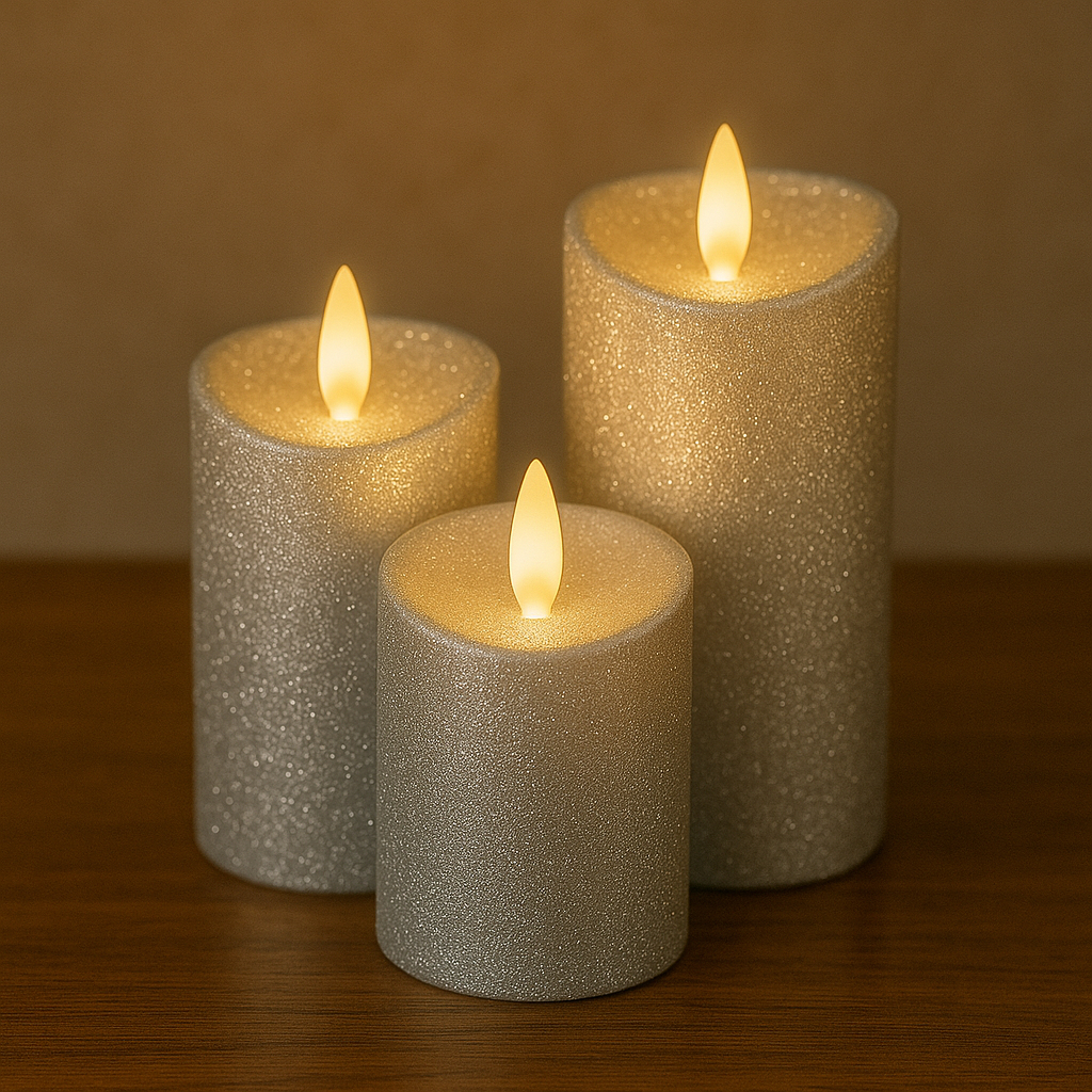 Rozsviťte svůj domov jemným světlem s touto elegantní 3dílnou sadou stříbrných svíček, které zaujmou svým třpytivým povrchem a nadčasovým vzhledem. Jsou vyrobeny z pravého parafínového vosku v kombinaci s odolným plastem, takže působí jako skutečné svíčky, ale bez nepořádku a kouře. Každá svíčka (průměr 7,5 cm, výšky 10, 15 a 20 cm) je napájena dvěma AA bateriemi a lze ji pohodlně ovládat dálkovým ovladačem. Praktický časovač zajistí, že se svíčky samy na 6 hodin rozsvítí a poté na 18 hodin zhasnou – ideální pro každodenní i sváteční použití. Tato sada je určena pro vnitřní dekoraci a dodá každému interiéru hřejivou, slavnostní atmosféru.