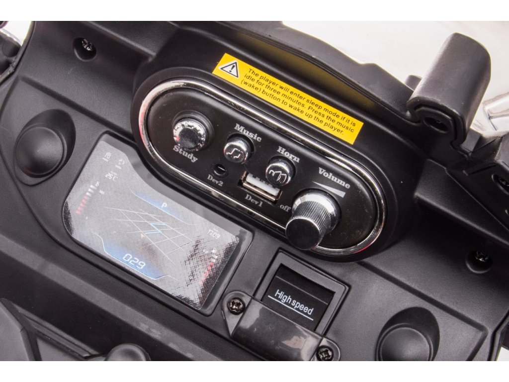 Díky EVA pěnovým kolům se vozidlo chová tiše a plynule i na nerovném povrchu, zatímco pohodlné sedadlo dodává pocit luxusu. Motorka navíc disponuje bohatou multimediální výbavou – nechybí přední osvětlení, USB a MP3 vstup, takže si děti mohou při jízdě užívat i svou oblíbenou hudbu. Tento vůz není jen hračkou, ale i plnohodnotným prostředkem pro rozvoj koordinace, fantazie a samostatnosti. Kombinace atraktivního vzhledu, moderních funkcí a důrazu na bezpečnost dělá z tohoto modelu ideální dárek pro každého malého automobilového nadšence.