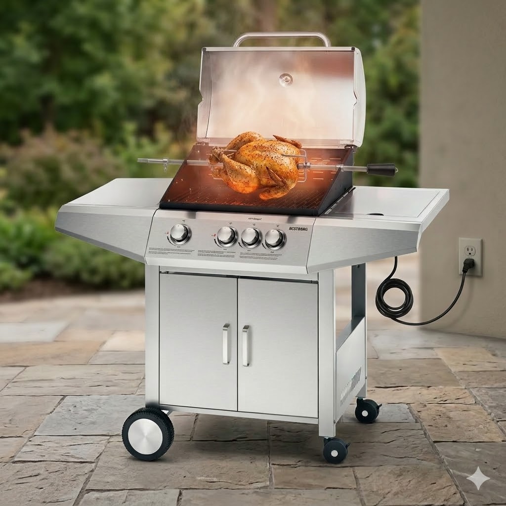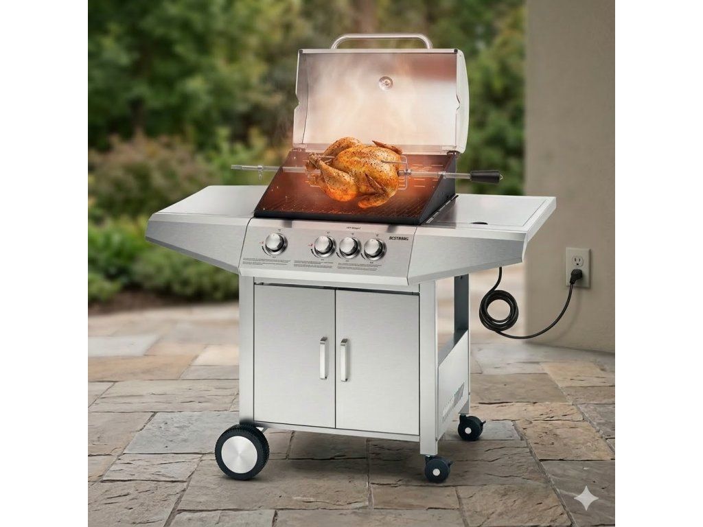 Chcete si na grilu dopřát dokonale šťavnaté kuře nebo rovnoměrně propečenou kýtu? Otočný rožeň s motorem pro model BBBQ-23ST zajistí automatické otáčení masa a perfektní výsledek bez námahy.