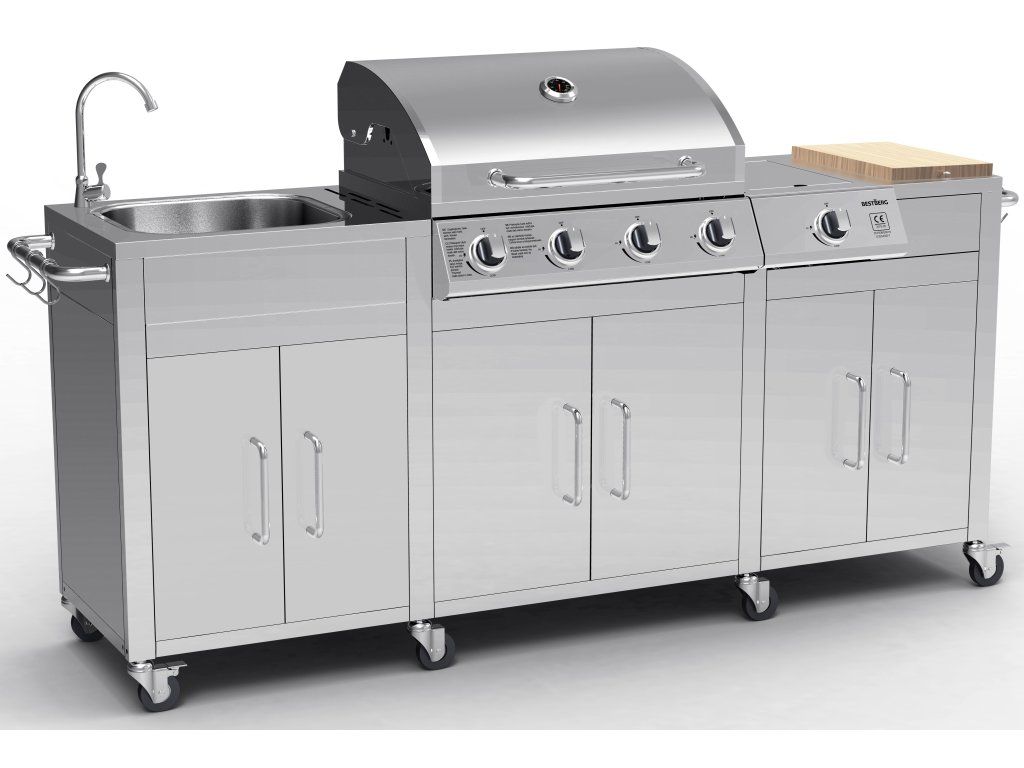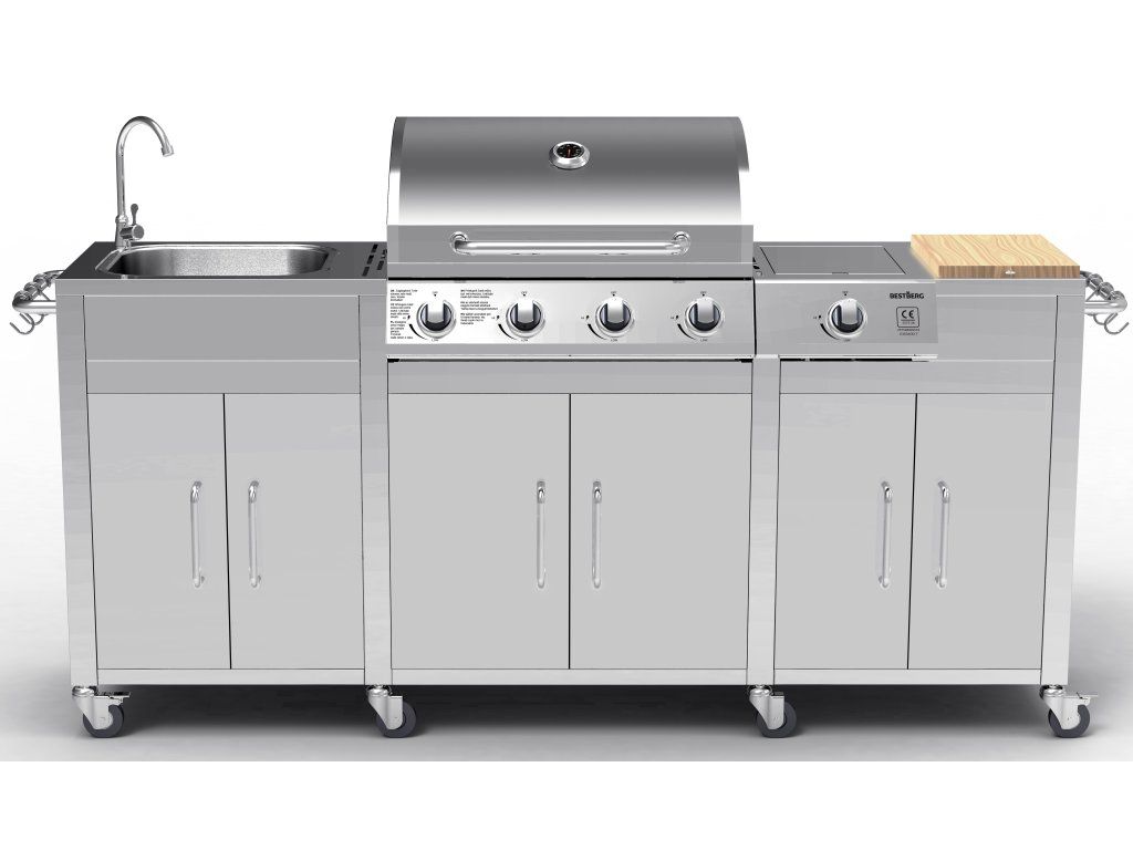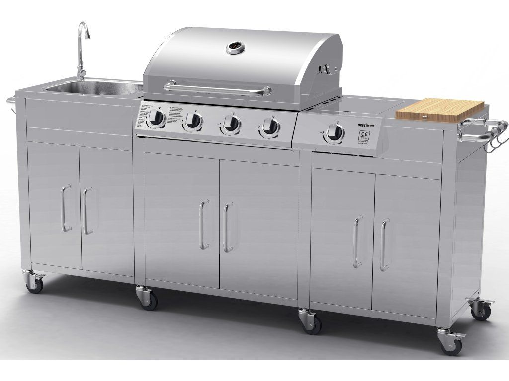 Kompletní venkovní kuchyně pro vaši zahraduZahradní BBQ kuchyně BestBerg je ideálním řešením pro všechny, kteří chtějí mít při grilování maximální komfort. Díky čtyřem hlavním hořákům (14 kW) a jednomu bočnímu (3,2 kW) snadno připravíte hlavní chody, přílohy i omáčky zároveň. Prostorná konstrukce s uzavíratelnými skříňkami nabízí dostatek místa pro přípravu pokrmů i jejich servírování. TIP: Boční hořák využijete například pro ohřev polévek nebo příloh, aniž byste museli opustit gril.