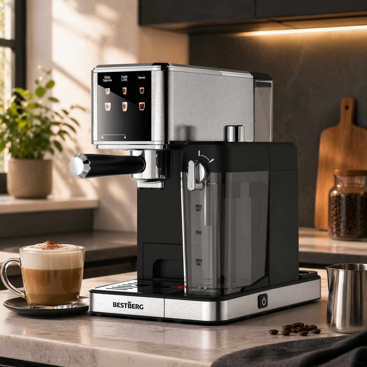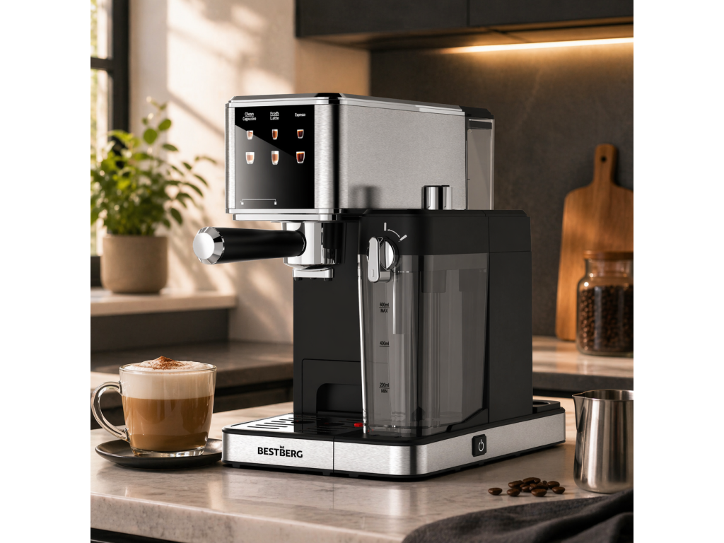 Praktické provedení pro pohodlné používáníKávovar BestBerg je navržen tak, aby byl nejen výkonný, ale i praktický pro každodenní použití. Nechybí vyjímatelná nádržka na vodu o objemu 1,2 l ani nádobka na mléko o objemu 0,6 l. Praktická je také vyjímatelná odkapávací miska s mřížkou, nahřívání šálků nebo výsuvná podložka pro malé espresso šálky. Potěší i úložný prostor na sítka a páku na zadní straně přístroje. TIP: Pravidelné čištění nádržky na vodu, mléko i odkapávací misky pomůže zachovat skvělou chuť kávy a prodlouží životnost přístroje.
