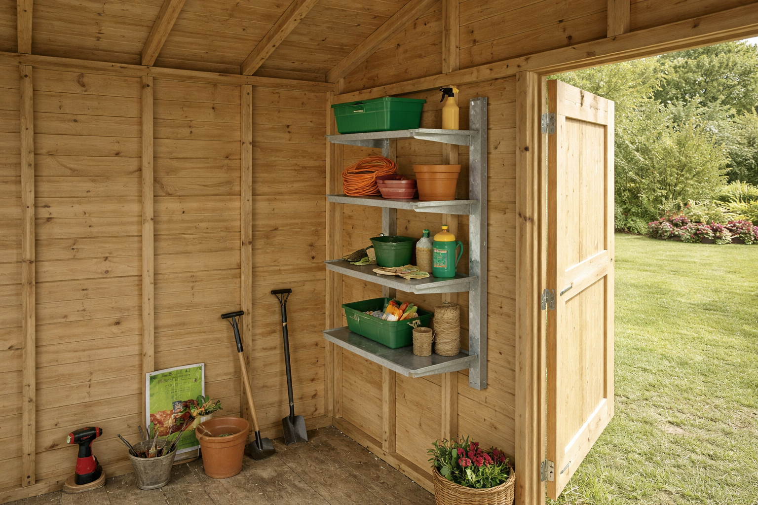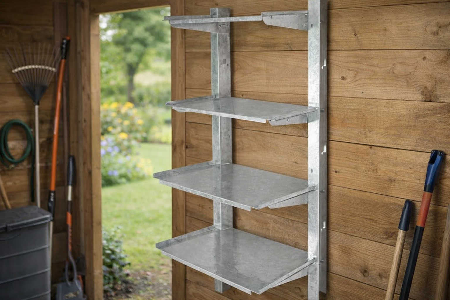 Policový regál do zahradního domku představuje jednoduchý a účelný způsob, jak si uspořádat zahradní vybavení.