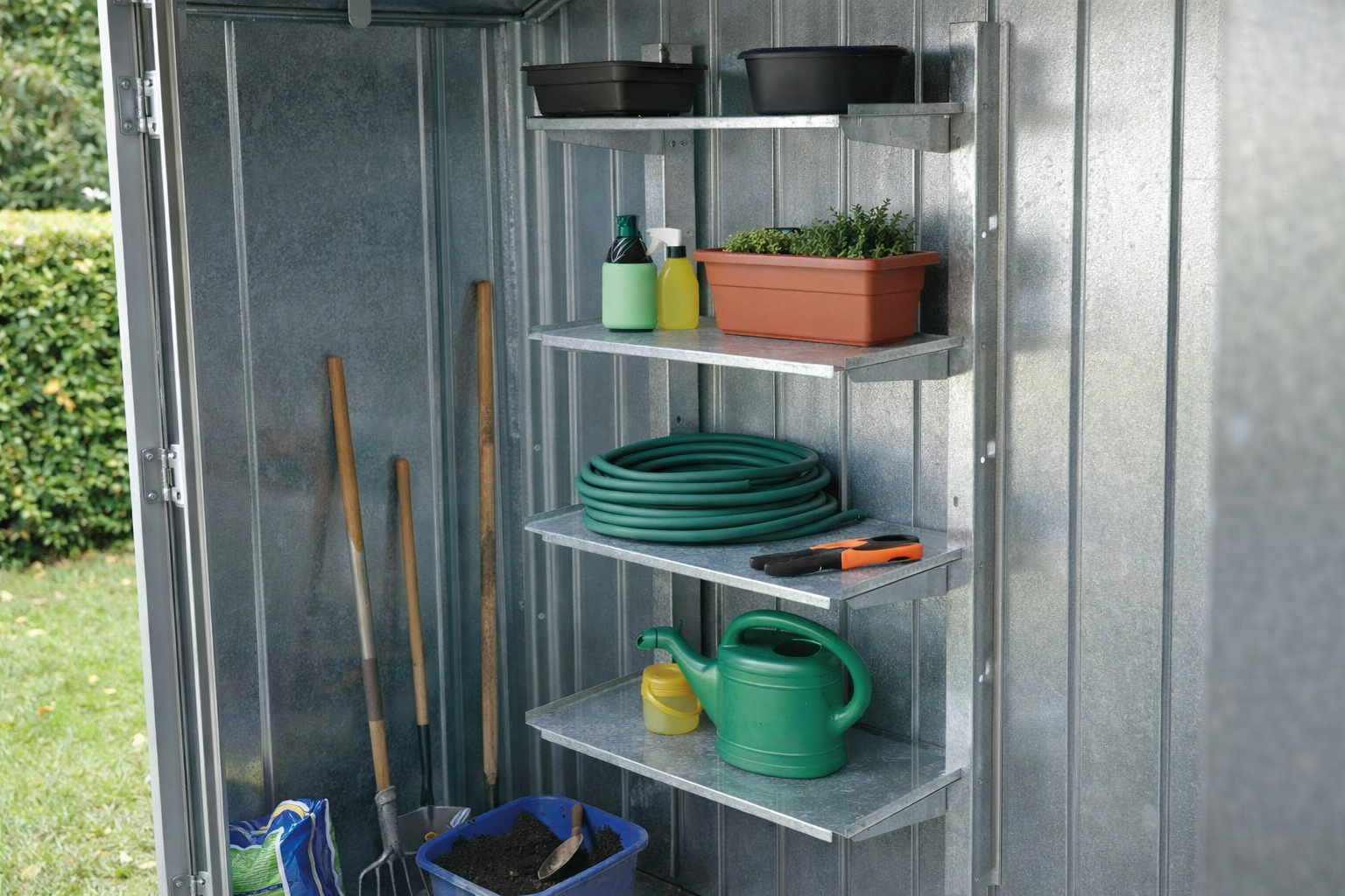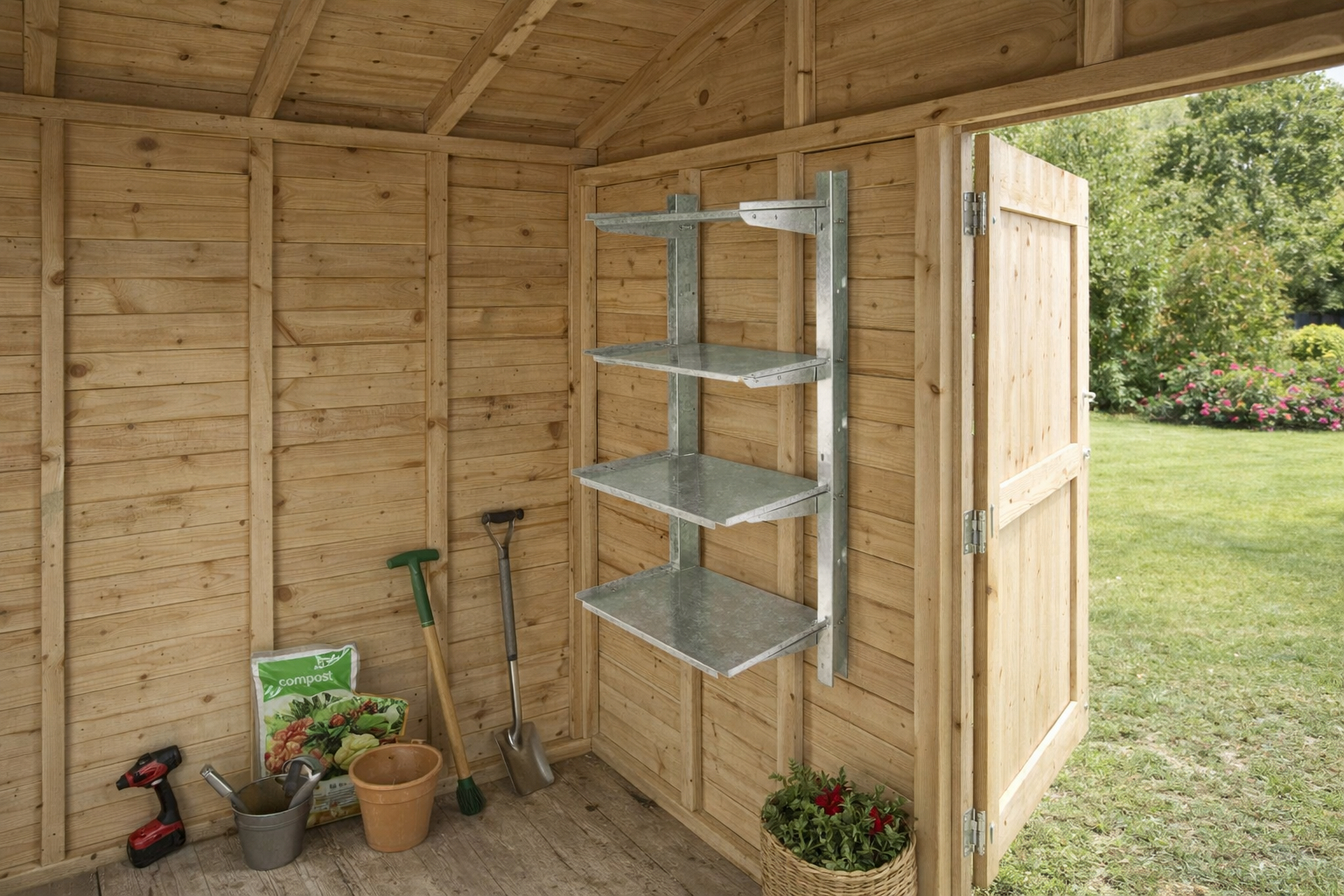 Díky závěsnému provedení regál nezabírá cenné místo na podlaze a pomáhá lépe využít prostor na stěnách zahradního domku.