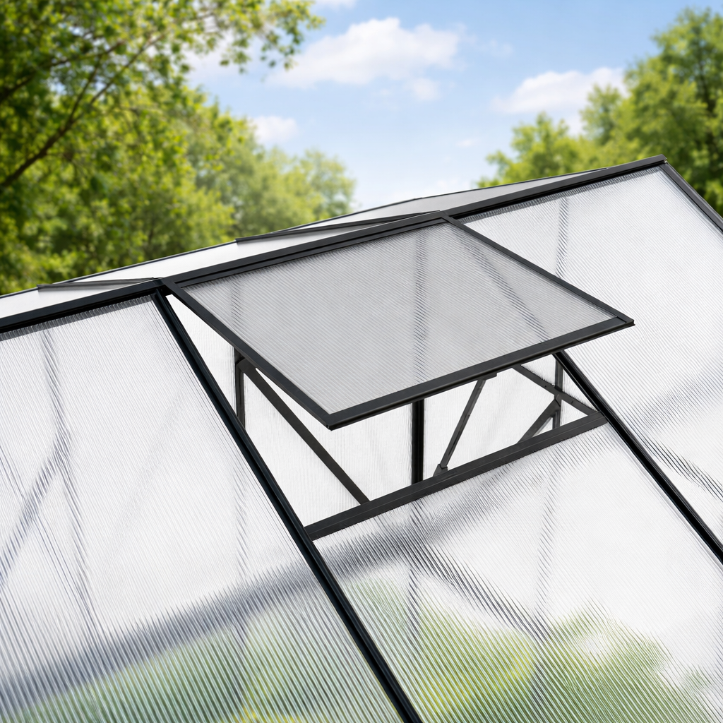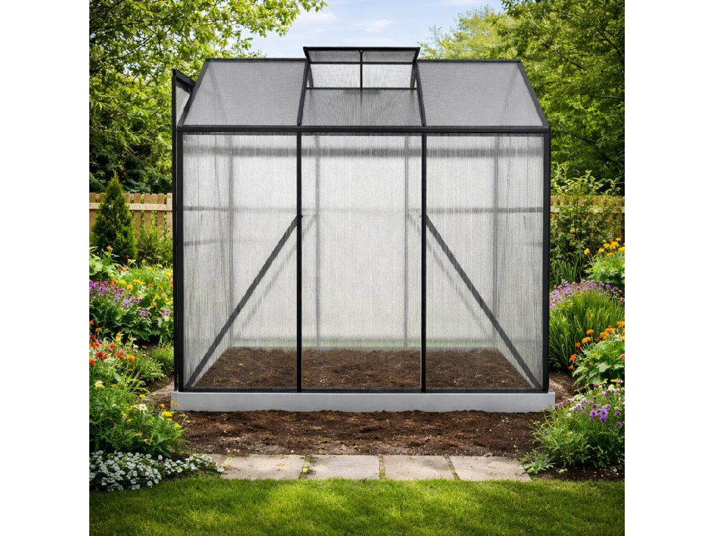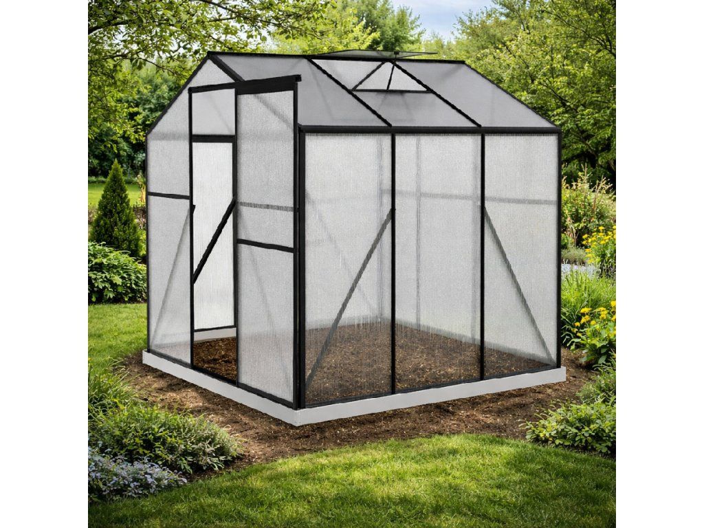 Praktické větrání a pevný základSkleník je vybaven jedněmi posuvnými dveřmi pro pohodlný vstup a jedním střešním ventilačním oknem pro regulaci teploty a vlhkosti. Součástí modelu je také základový rám, který zvyšuje stabilitu celé konstrukce. TIP: Pro maximální stabilitu doporučujeme základový rám ukotvit k pevnému podkladu.