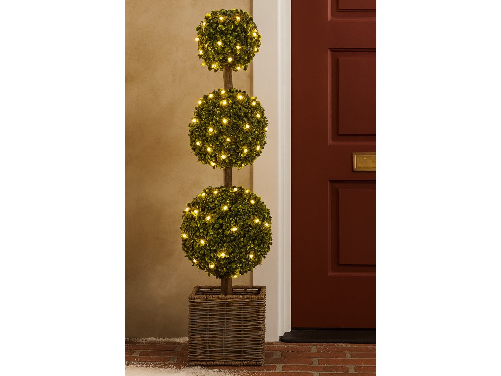 Vneste do svého domova či na terasu nádech elegance s tímto stylovým umělým stromkem v květináči. Jeho dokonale tvarované tělo tvoří tři zelené koule o průměrech 18 cm, 22 cm a 28 cm, které vytvářejí harmonický a moderní vzhled. Stromek stojí v pevném květináči o rozměrech 20×20×20 cm a s ním dosahuje výšky 100 cm – ideální velikost pro umístění u dveří, na terase nebo v interiéru. Jemné teplé osvětlení z integrovaného světelného řetězu s certifikací IP44 na 3× AA baterie dodá stromku útulnou atmosféru. Díky praktickému časovači se světla automaticky zapínají na 6 hodin a poté na 18 hodin vypínají. Dekorace je vhodná pro použití jak uvnitř, tak venku a rozzáří váš prostor po celý rok.