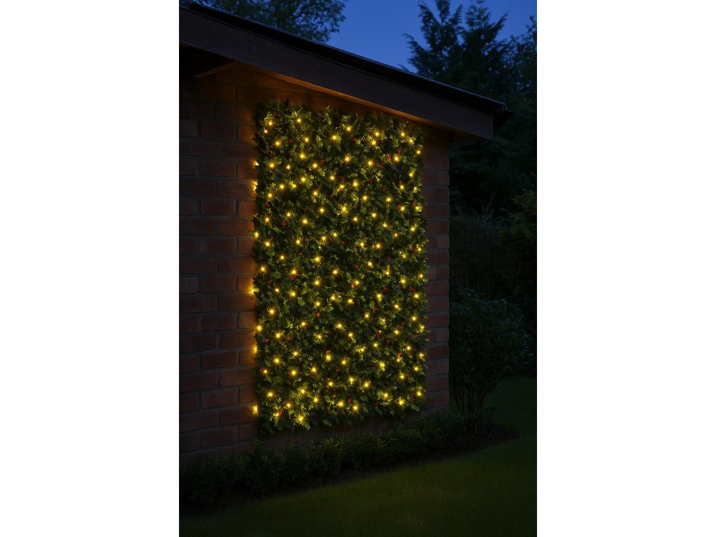 Vytvořte okouzlující vánoční atmosféru s naším umělým živým plotem/zástěnou z cesmínových listů a bobulí! Dekorace o rozměru 2 × 1 m je osazena 100 LED diodami, které rozzáří každý prostor teplým a vánočním světlem. Díky odolnosti IP44 je vhodná i pro použití venku, a napájení na 3× AA baterie s časovačem 6/18 h umožňuje jednoduché a pohodlné používání bez kabelů. Ideální pro okna, balkony, terasy či ploty, promění každý kout v kouzelnou sváteční scenérii.