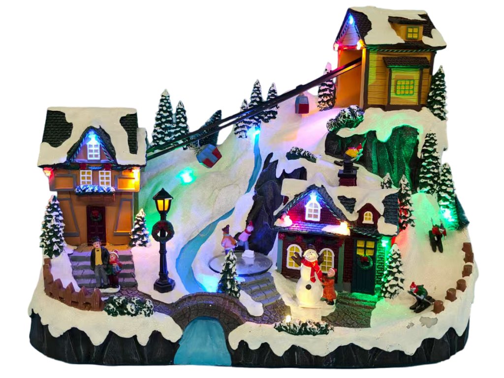 Vneste do svého domova kouzlo Vánoc s touto detailně zpracovanou vánoční scénkou, která okouzlí děti i dospělé. Hlavním motivem je krásně nazdobená vánoční lanovka obklopená figurkami, které vytvářejí útulnou a slavnostní atmosféru. Vesnička se skvěle hodí jako dekorace na stůl, komodu nebo poličku. Dekorace je napájena pomocí přiloženého síťového adaptéru.