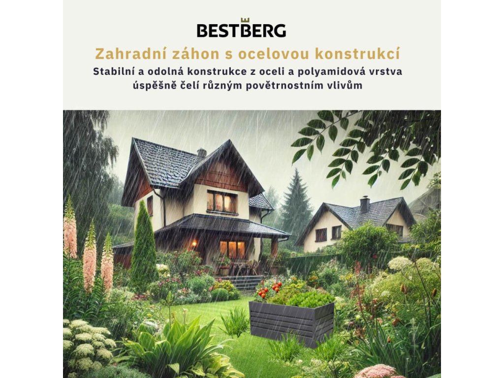 Vysoce kvalitní a odolný vyvýšený záhon BestBerg VZ-1100AStabilní a odolná konstrukce z oceli a polyamidová vrstva úspěšně čelí různým povětrnostním vlivům.