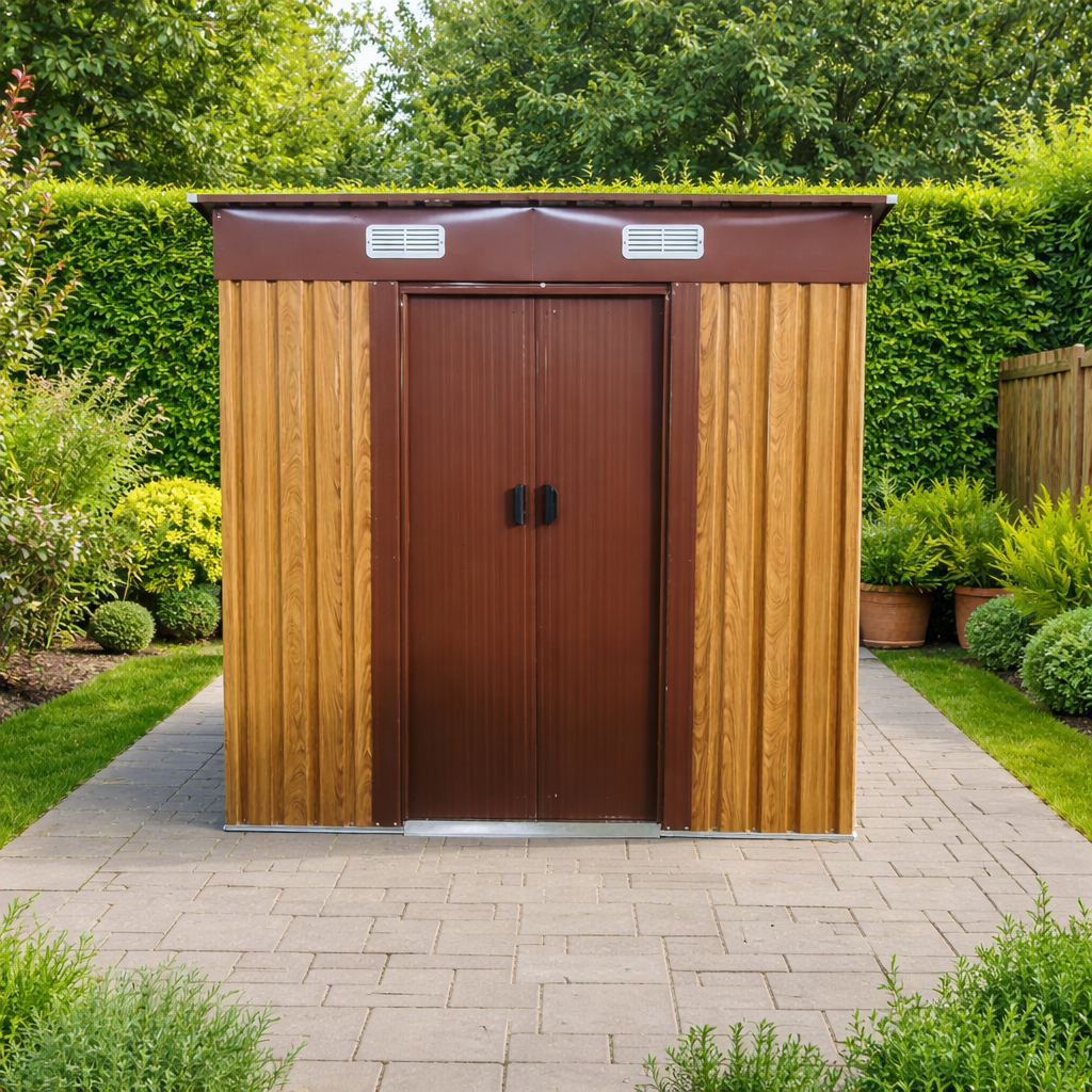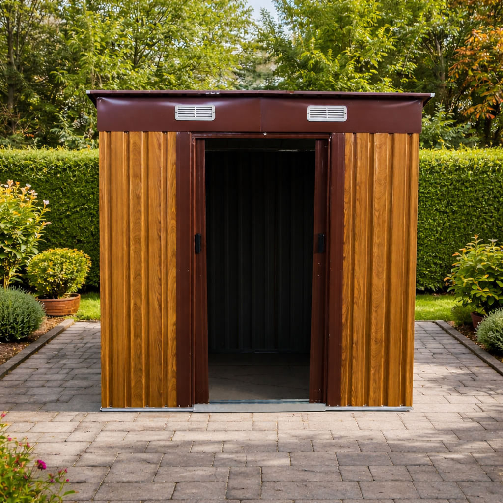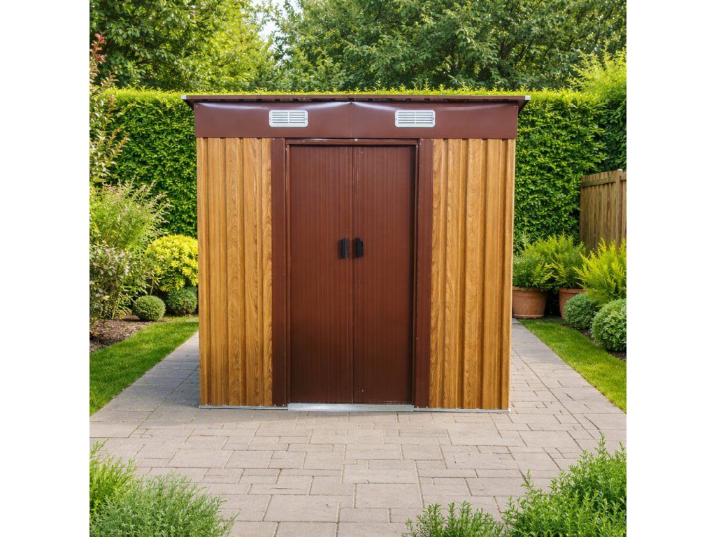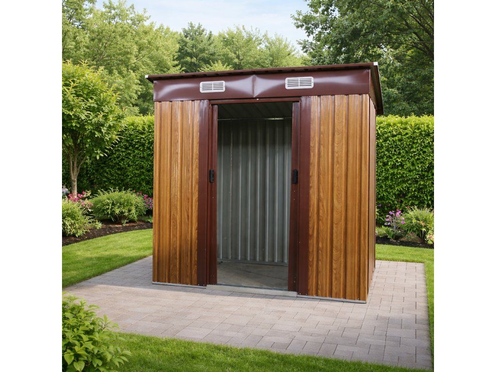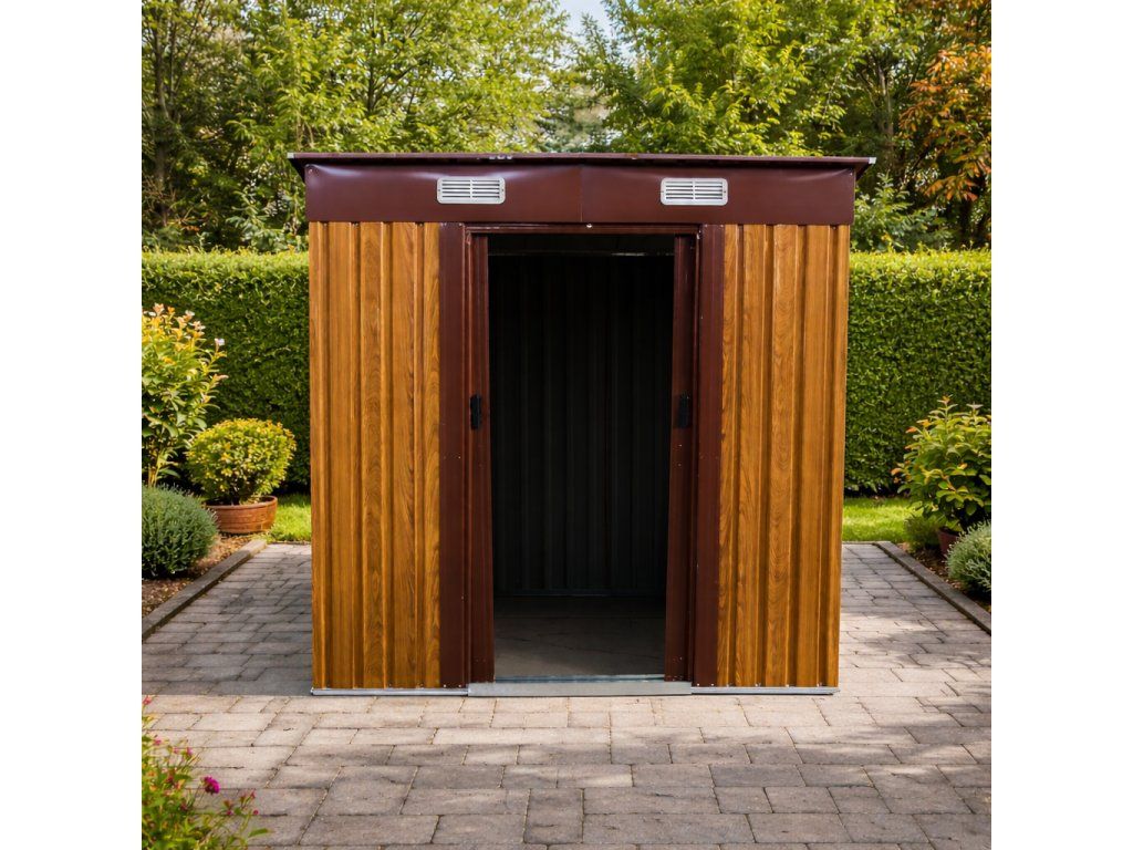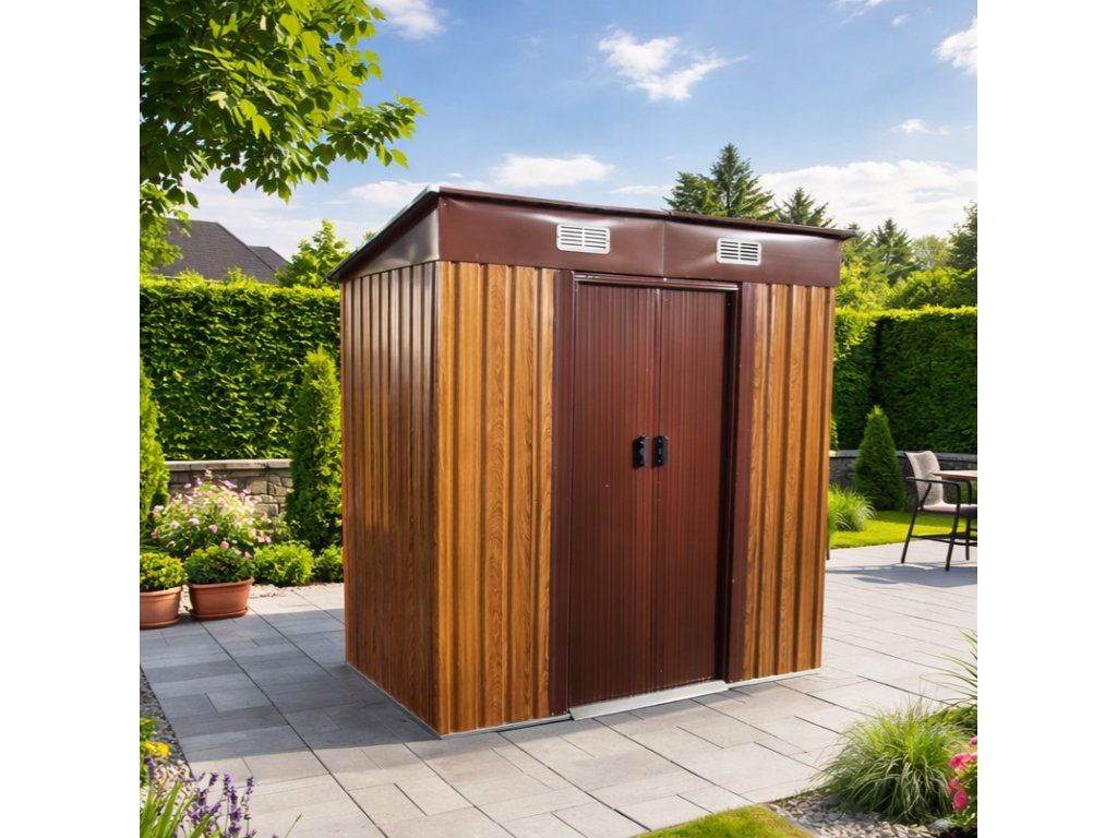 Moderní design s praktickou pultovou střechouKovový zahradní domek v kombinaci dekoru dřeva a hnědé působí elegantně a zároveň technicky čistě. Díky pultové střeše je zajištěn efektivní odvod vody a sněhu.