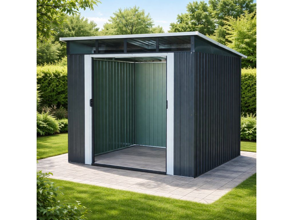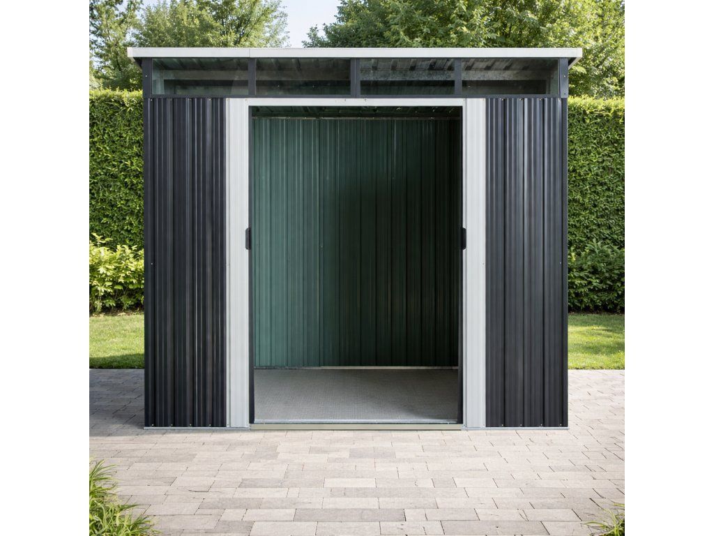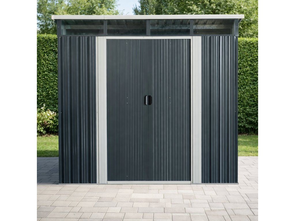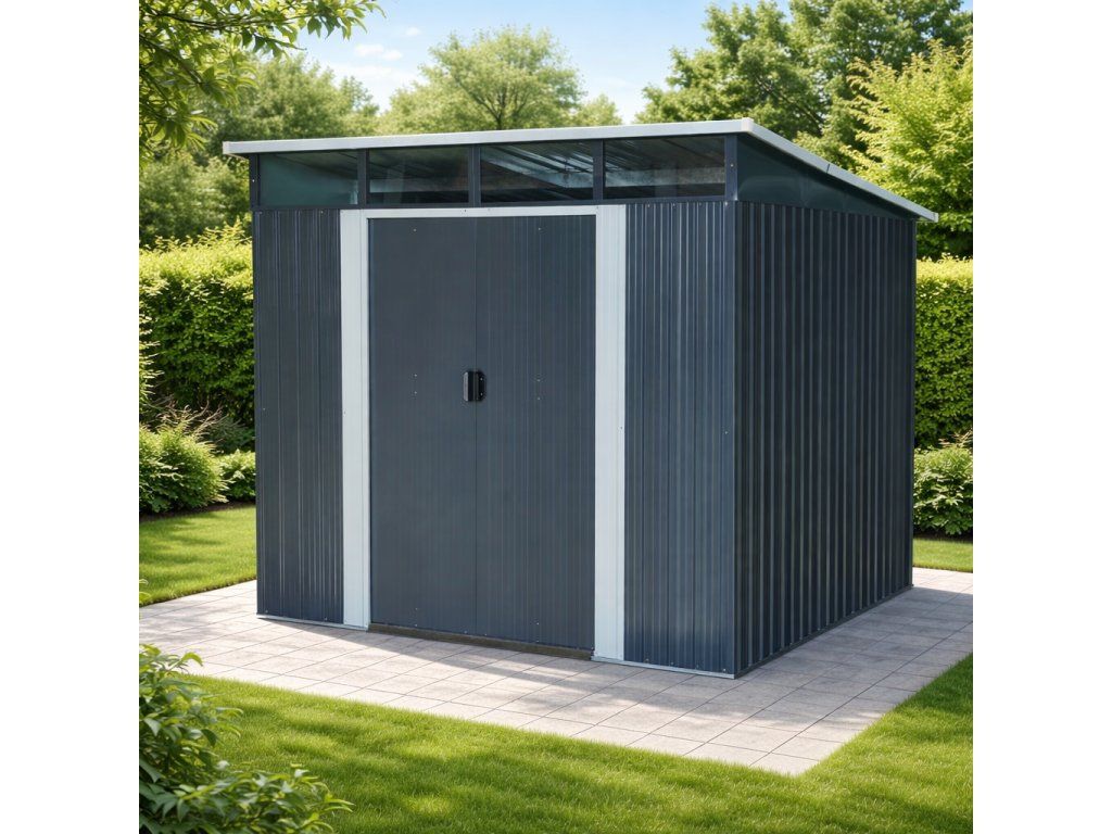 Moderní design s praktickým světlíkemKvalitní zahradní domek v elegantním antracitovém nebo bílém provedení skvěle zapadne do každé zahrady i dvora. Díky ploše 5,6 m² poskytuje dostatek prostoru pro uskladnění zahradní techniky i dalšího vybavení. Světlík z odolného polykarbonátu přivádí do interiéru přirozené světlo, takže se uvnitř pohodlně pohybujete i bez nutnosti umělého osvětlení. TIP: Pultová střecha nejen moderně vypadá, ale zároveň umožňuje efektivní odtok dešťové vody.