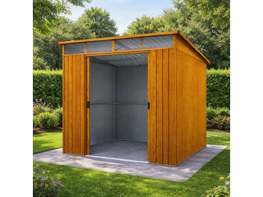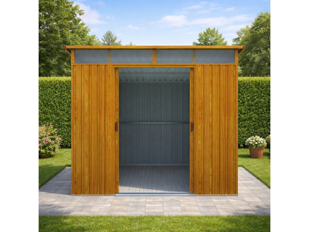 Pohodlný vstup díky širokým posuvným dveřímDvoukřídlé posuvné dveře o rozměrech 173 × 103 cm umožňují snadnou manipulaci i s objemnějším vybavením, jako jsou sekačky nebo jízdní kola. Posuvný systém šetří místo před domkem a neomezuje prostor při otevírání. TIP: Na madla lze umístit visací zámek pro zvýšení bezpečnosti uložených věcí.