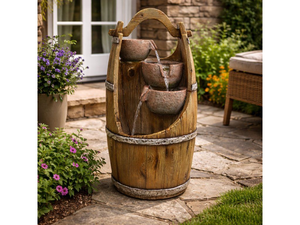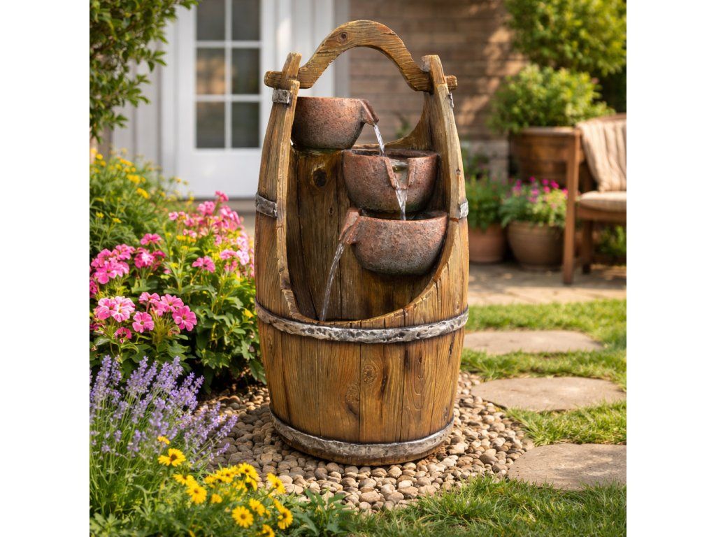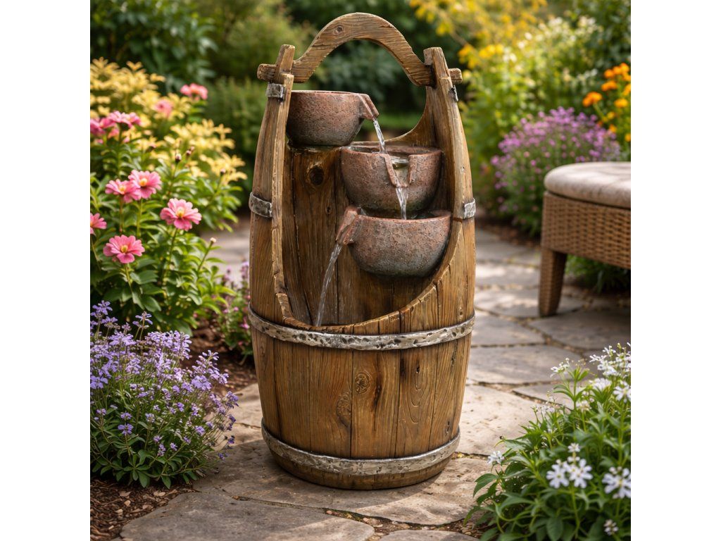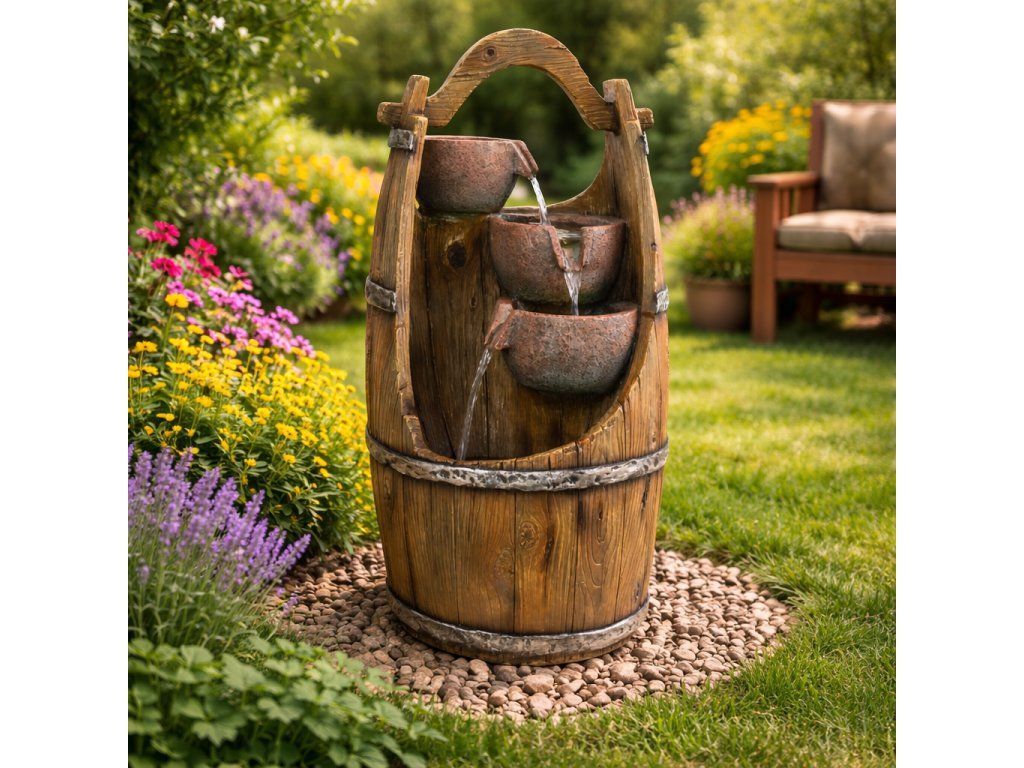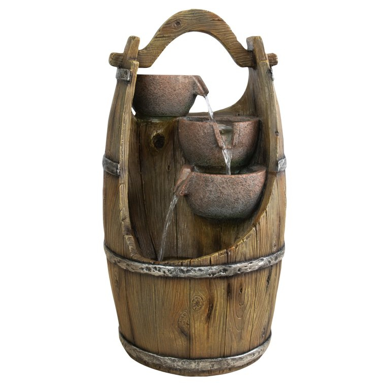 Chcete si ozdobit vaši zahradu nebo domov, a navíc si při sezení pořádně odpočinout? Pak by vám neměla chybět zahradní fontána. Navodí tu správnou relaxační náladu díky příjemným zvukům tekoucí vody a oceníte ji navíc i vizuálně. Motivy ve tvaru džbánků v sudu krásně doplní vaši zahradu. Ve večerních hodinách si také užijete podsvícení LED světýlky.