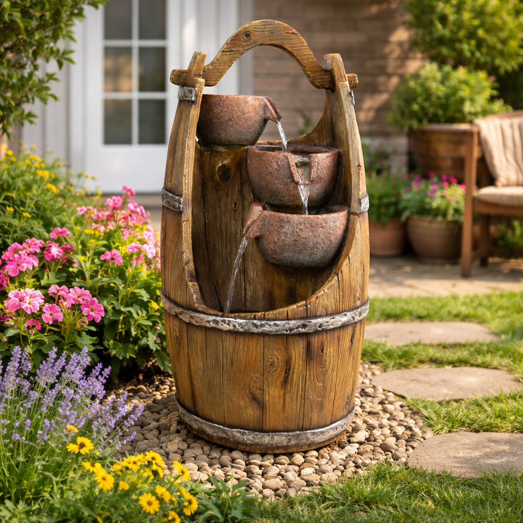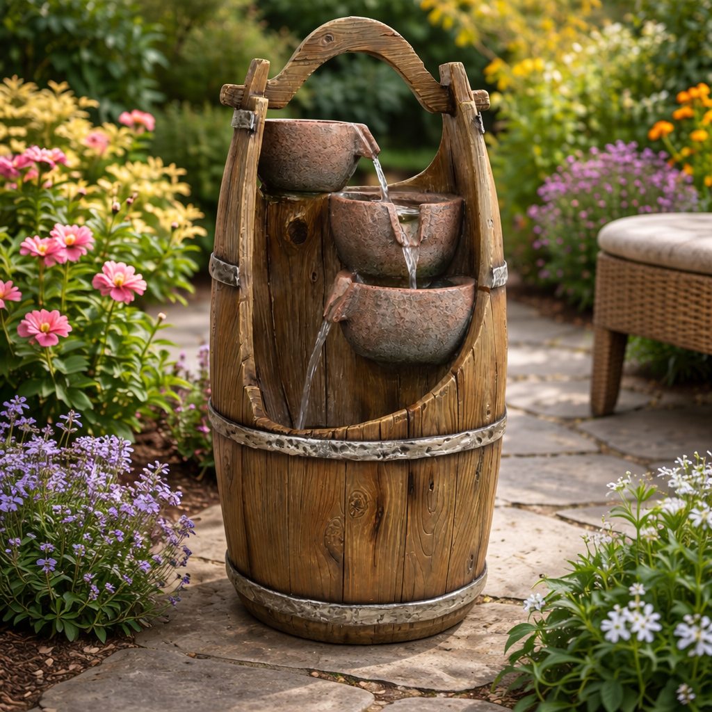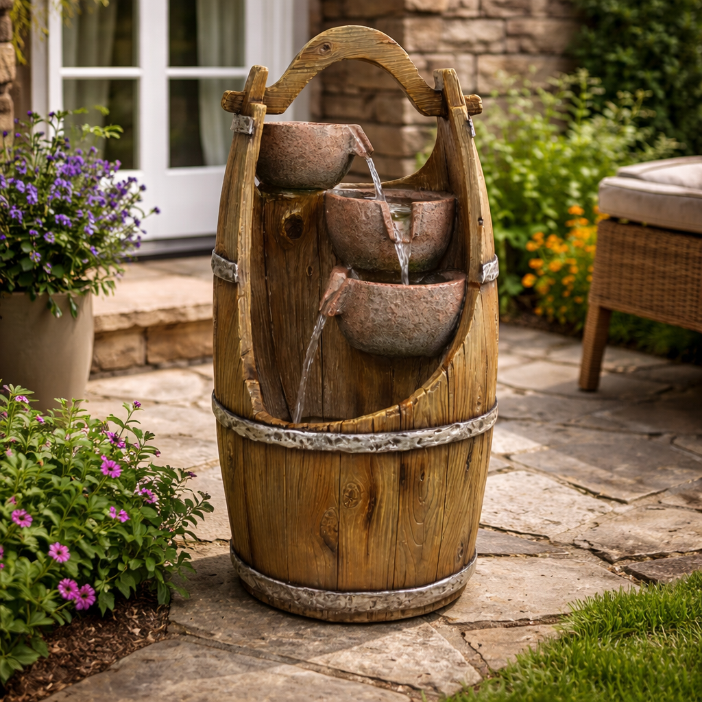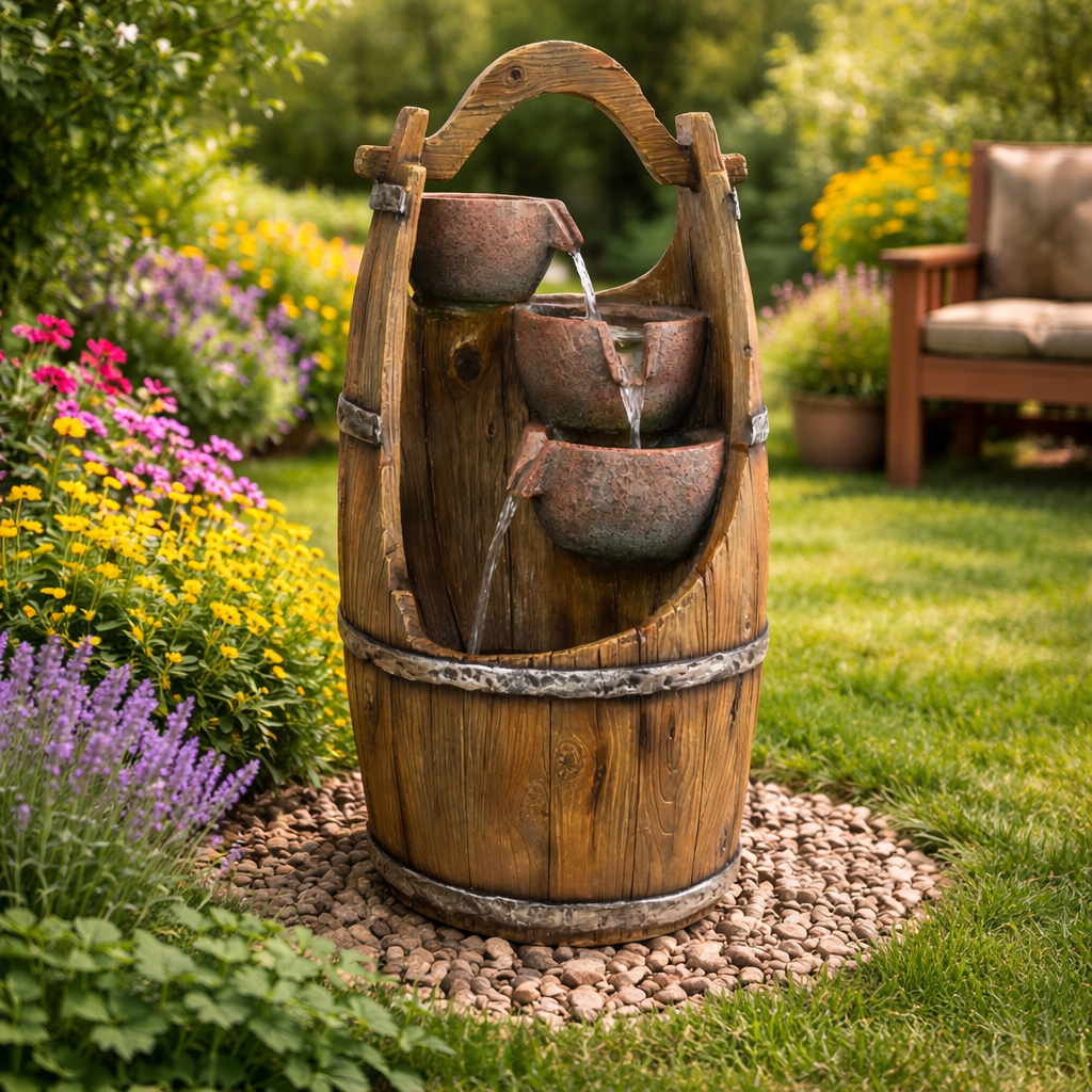 Chcete si ozdobit vaši zahradu nebo domov, a navíc si při sezení pořádně odpočinout? Pak by vám neměla chybět zahradní fontána. Navodí tu správnou relaxační náladu díky příjemným zvukům tekoucí vody a oceníte ji navíc i vizuálně. Motivy ve tvaru džbánků v sudu krásně doplní vaši zahradu. Ve večerních hodinách si také užijete podsvícení LED světýlky.