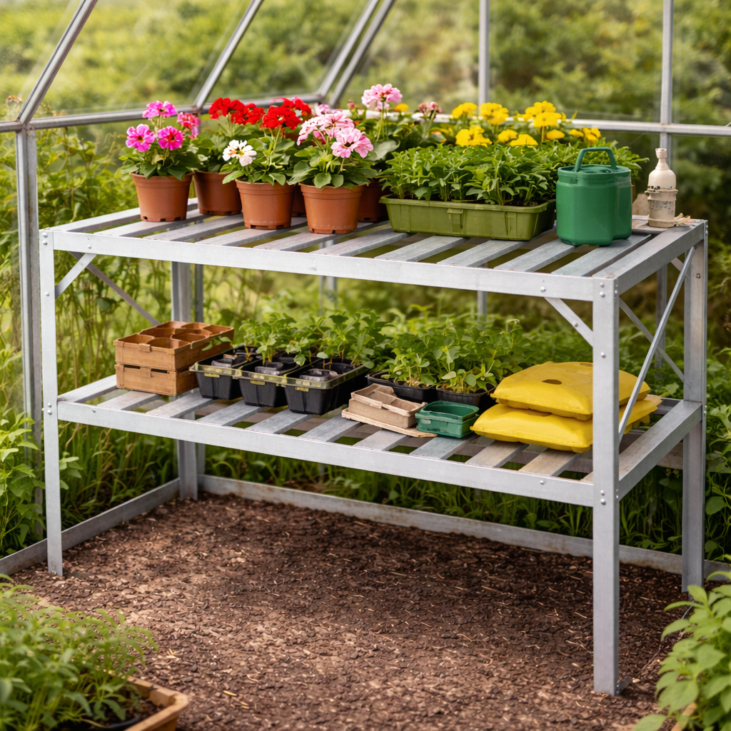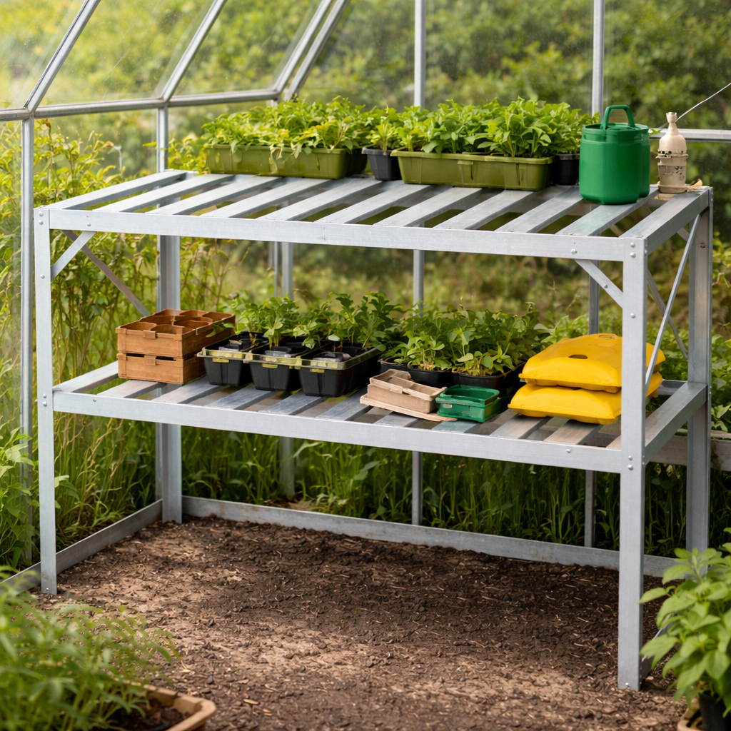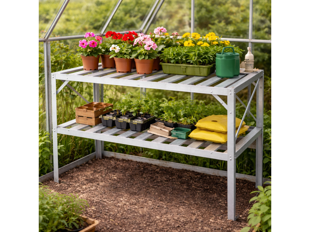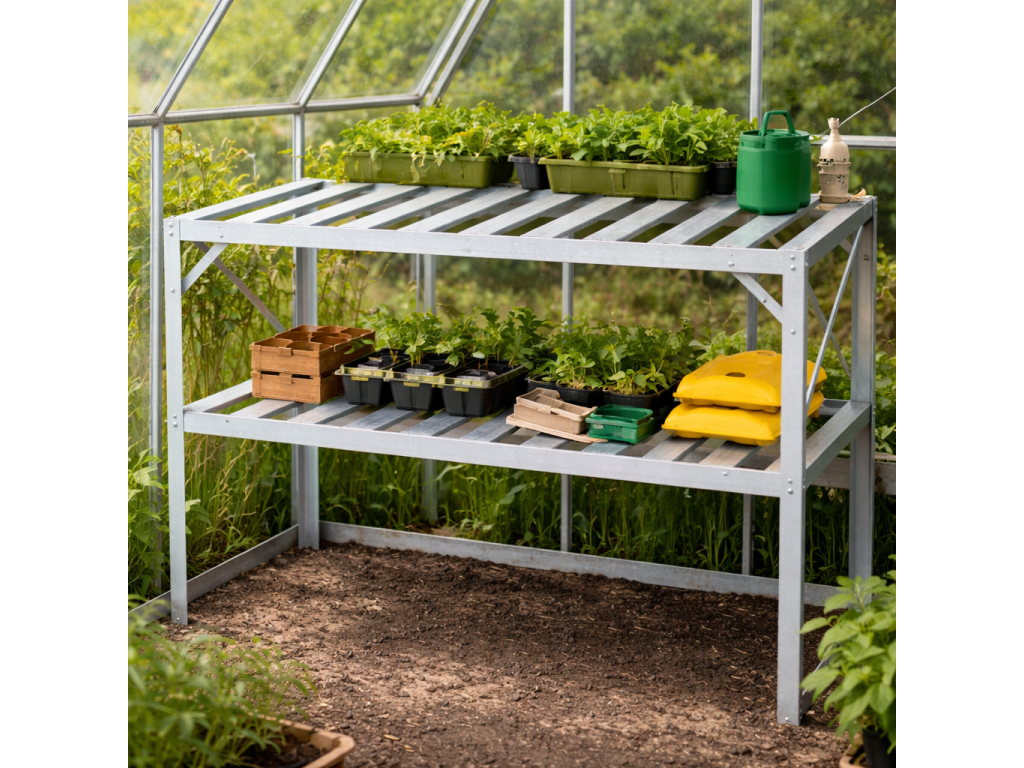 Praktické řešení pro váš skleníkDvoupolicový regál je navržen tak, aby dokonale zapadl do většiny standardních skleníků. Pomáhá efektivně využít výšku prostoru a rozšířit pěstební plochu. Poskytuje dostatek místa pro sadbovače, květináče i zahradní nádoby a umožňuje lepší organizaci prostoru. TIP: Umístěním rostlin na vyvýšenou polici zajistíte lepší přístup světla i pohodlnější manipulaci.
