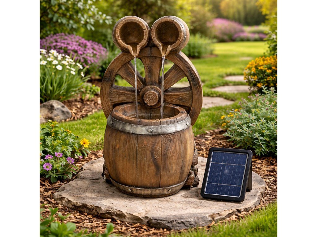 Chcete si ozdobit vaši zahradu, a navíc si při sezení pořádně odpočinout? Pak by vám neměla chybět solární zahradní fontána. Navodí tu správnou relaxační náladu díky příjemným zvukům tekoucí vody a oceníte ji navíc i vizuálně. Motiv mlýnského kola v dřevěném stylu krásně doplní vaši zahradu. Ve večerních hodinách si také užijete podsvícení LED světýlky.